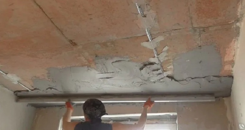Для устранения мелких дефектов отделочники сразу крепят к стенам или потолку маяки в виде металлических профилей, и за один день выполняют весь фронт работы.
