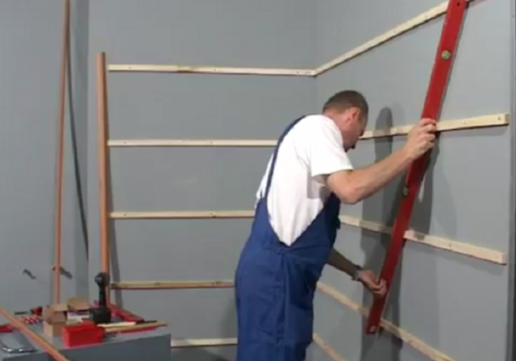 Лишь только необходимо: прогрунтовать стены, распределить проводку, вывести наружу все провода, нанести разметку. Обрешетка используется в случае утепления поверхности стен, большая влажность помещения, поверхность имеет слишком большие неровности. Единственным отрицательным моментом является монтаж каркаса, который уменьшает пространство комнаты на несколько сантиметров.