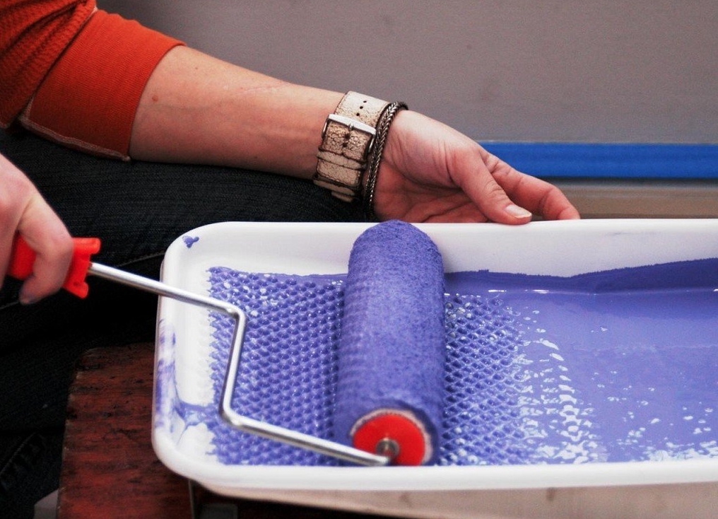 Что касается непосредственно нанесения, то валик окунается не полностью, иначе будут образовываться подтеки. Нанесение также будет неудобным и грязным. Лучше всего слегка окунуть валик, прокатать по верхней части кюветы, равномерно распределяя материал. Перед первым применением смочите валик обычной водой и тщательно отожмите – он станет мягче, к тому же потребление краски слегка уменьшится.